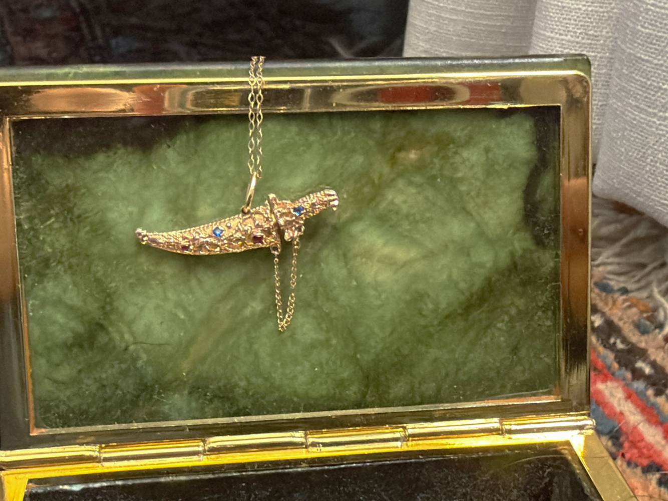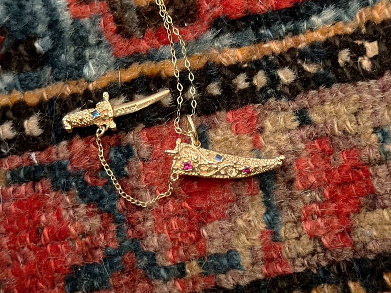 Saving the best for last - the dagger charm! This charm is made out of 14k gold, rubies and sapphires.